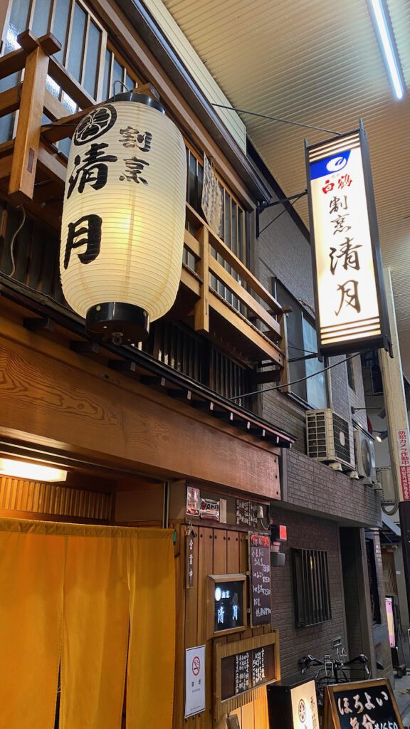 On a sunny day in April, 2025. After we went to see Yoshitsune Senbonzakura at the National Bunraku Theatre, my mother and I were hungry. Along the way, walking back to the subway station from the theatre, I happened to turn my head on the right, and noticed the character on the sign of an old Japanese-style restaurant. I could only see the second character and it was “月.”